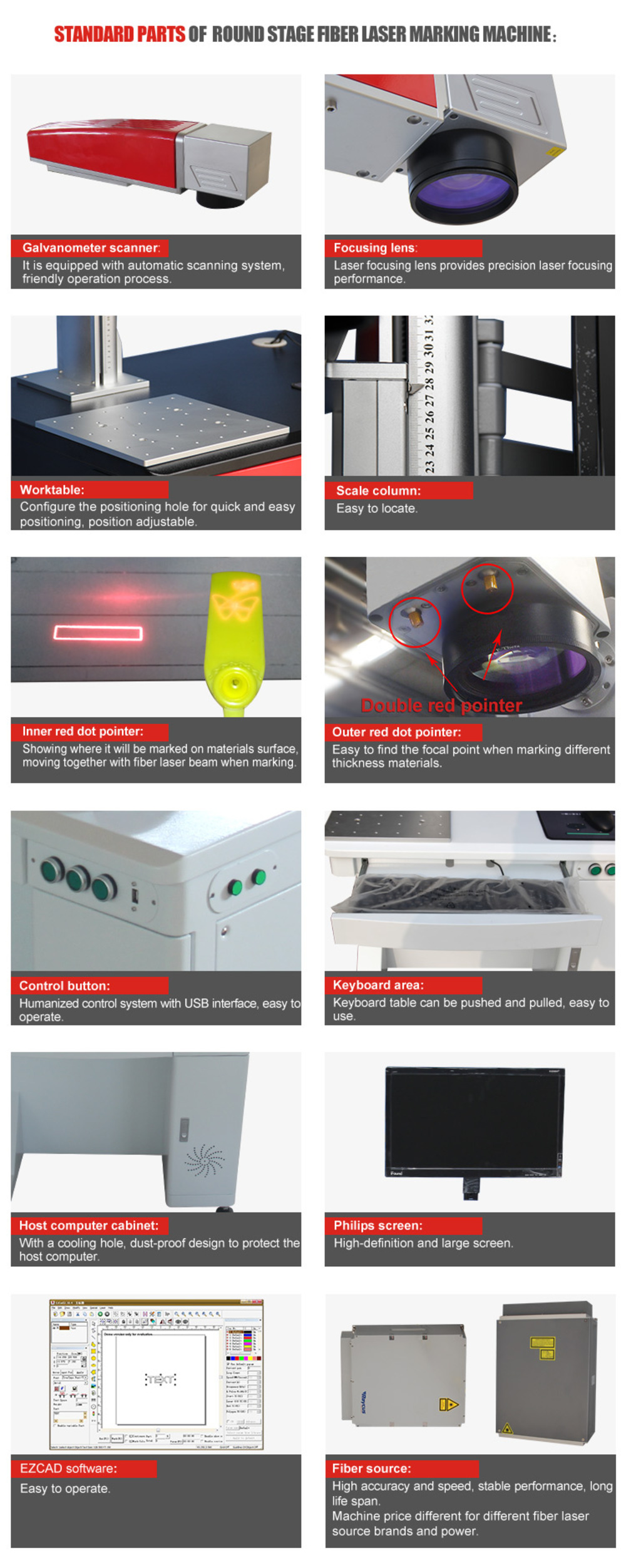 The fiber laser marker works well with all kinds of metals, plastics, electroplating, metal coating, rubber, ceramic and so on, and it is widely used in many fields like plastic press button, integrated circuit, electronic art, communication product, bath product, spectacles, watch, jewelry, etc. It is often used asmetal marking machine,hardware laser marking machine,barcode laser marking machine, plastics laser marking machine, stainless steel laser marking machine, etc.