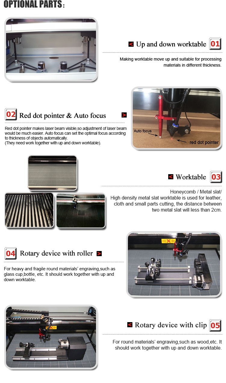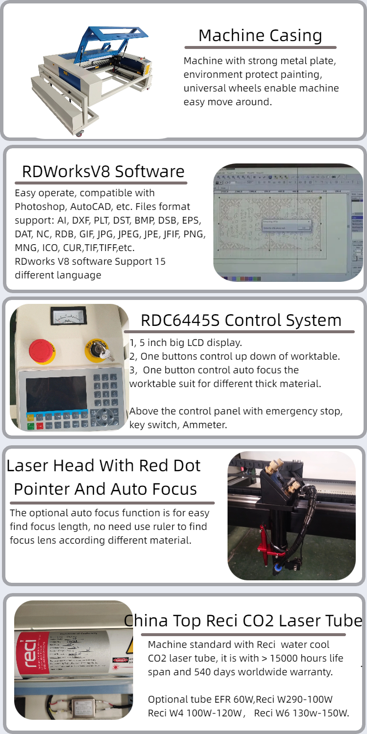 This equipment can be applied to different kinds of materials and has many advantages such as smooth cutting edges, free from polishing, dust free, fast processing speed, high precision, less waste and higher efficiency. It is the best optional for upgrading traditional equipments in various industries. The professional laser engraving and cutting software installed in it, is particularly designed and written for engraving and cutting It's with high compatibility powerful editing function, friendly interface, easy to install and use, can support DXF, PLT, BMP, Al and many other graphs, support win 7, win 8 and win 10 computer operating system