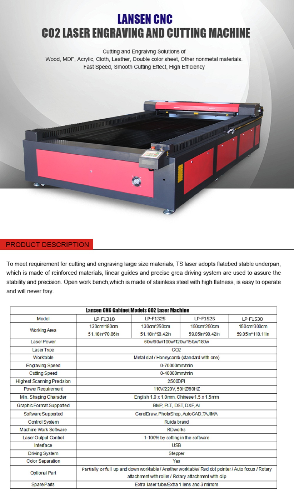 This 1325 flatbed co2 laser engraving cutting equipment with 1300*2500 work size and RUD6445S control ,can be applied to different kinds of Non mental material such as double color sheets, acrylic, glass, wood planks, paper, leather, rubber, marble, granite and titles, glass, cloth, paper, Foam, Rubber ect.