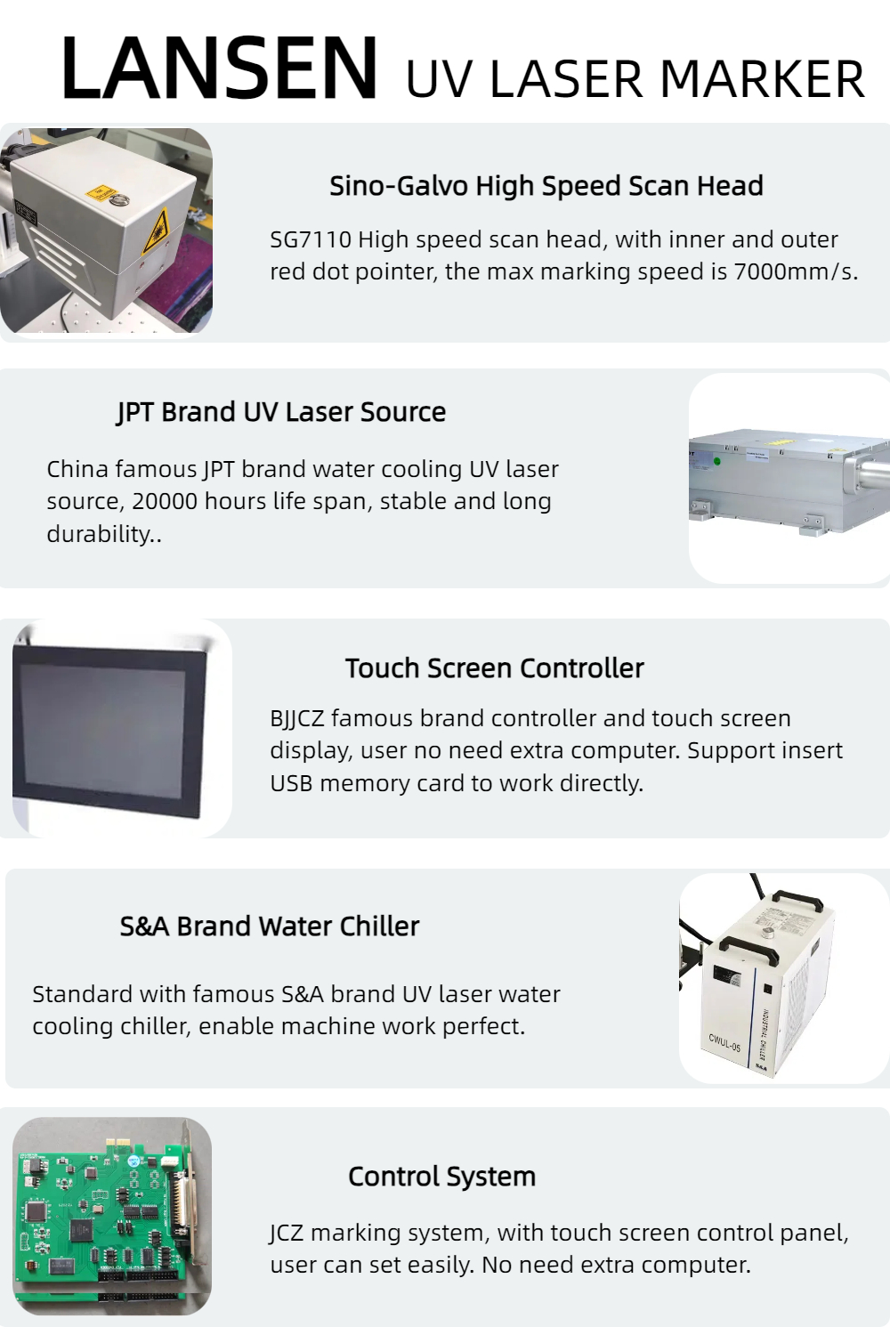 UV laser marking machine takes 355nm light laser device as the light source. Ultraviolet laser marking machines have the advantage of limiting thermal stress that other laser machines do not.Mainly used for glass wood lether metal acrylic etc .