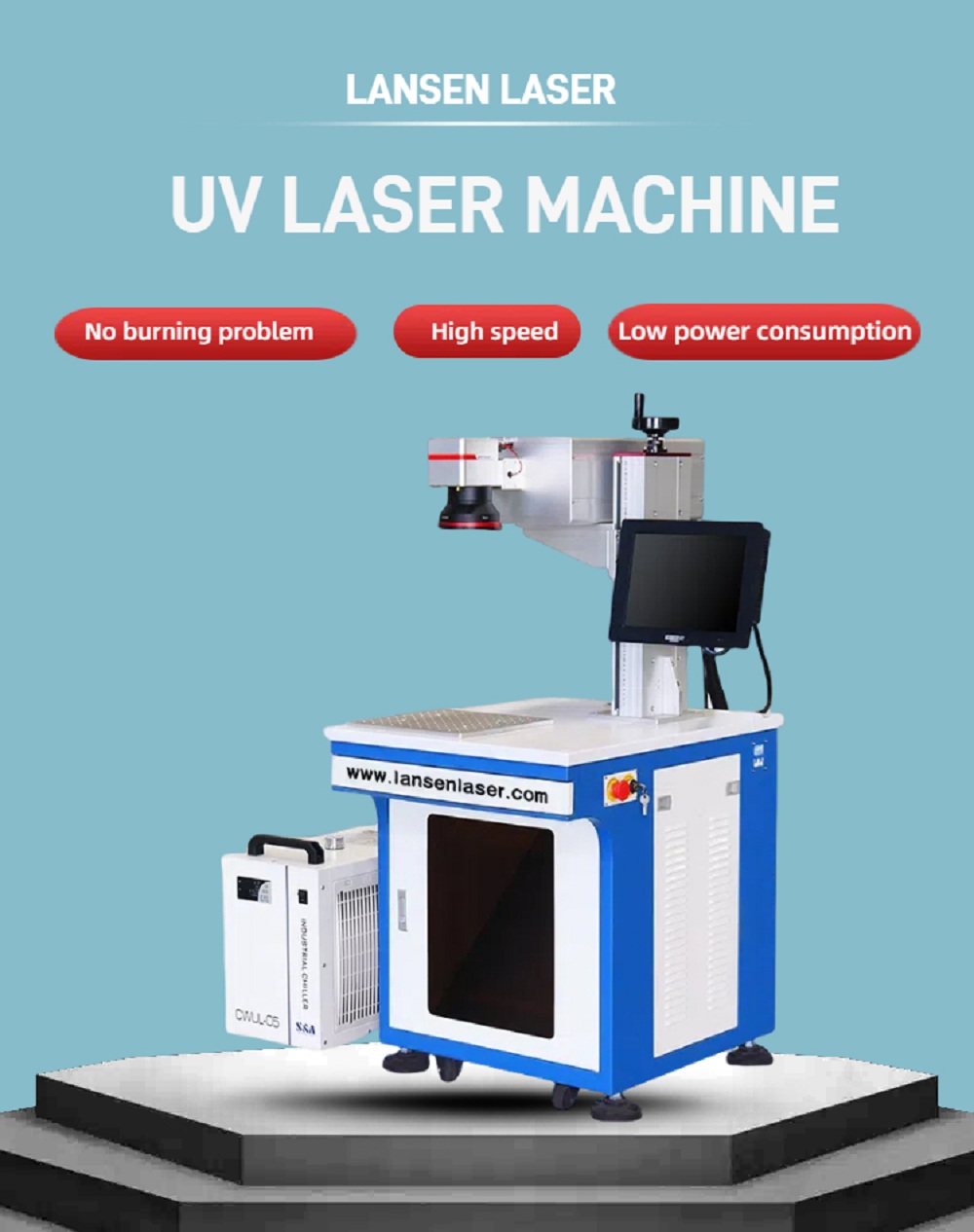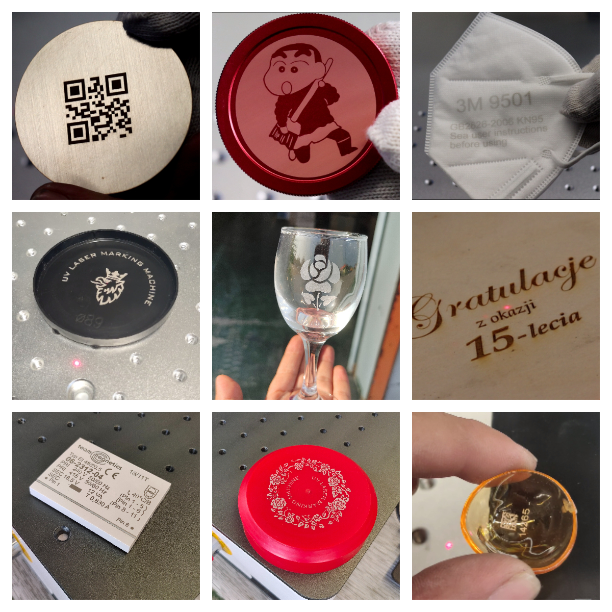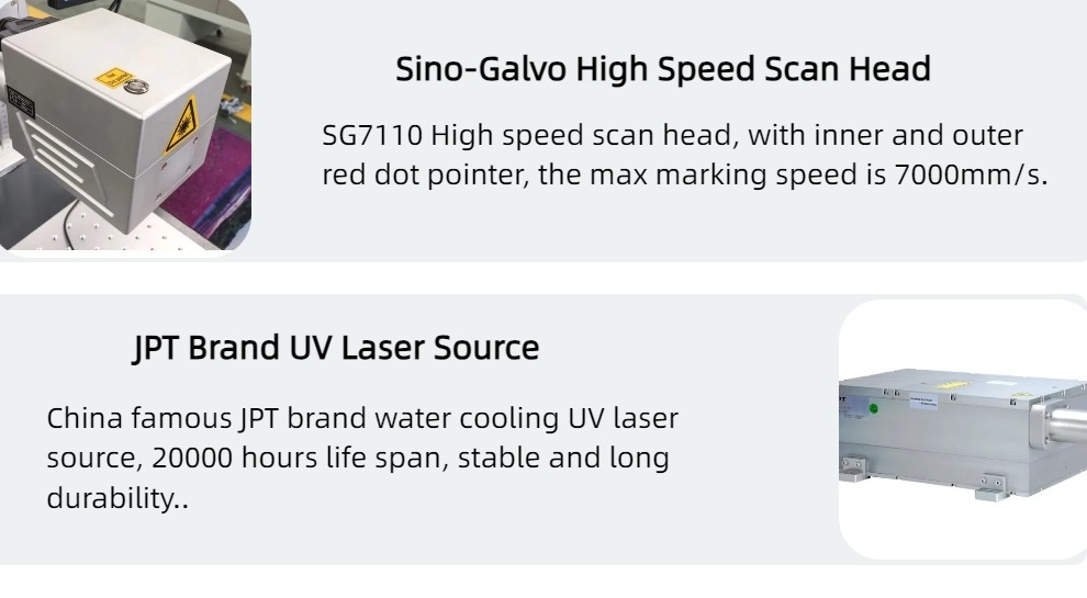 The machine takes 355nm light laser device as the light source. Ultraviolet laser marking machines have the advantage of limiting thermal stress that other laser machines do not.It can be marked on the metal and non-metallic materials for surface processing and coating film processing